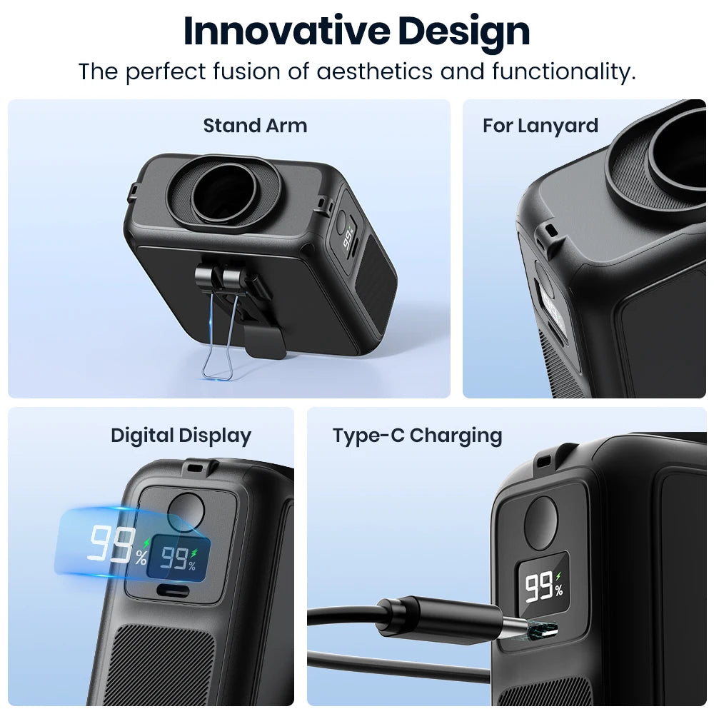 - You get all-day cooling from a 10000mAh rechargeable battery and a 5W motor designed for long-lasting runtime, even during extended outings.